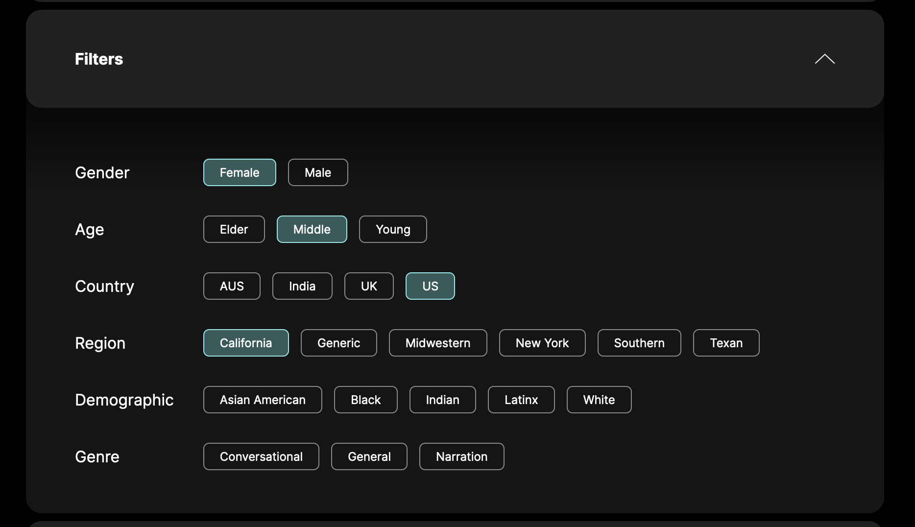 Using these filters, and using the play button to hear the voices, you’ve determined Colby will be a great voice for your application. You can then use Colby as the speaker parameter for Rime’s TTS API.